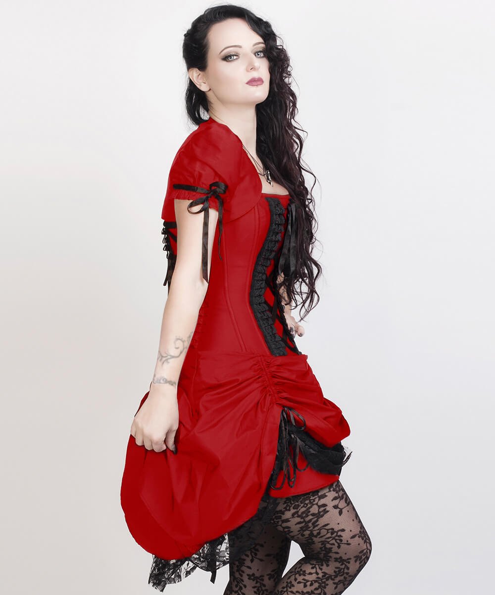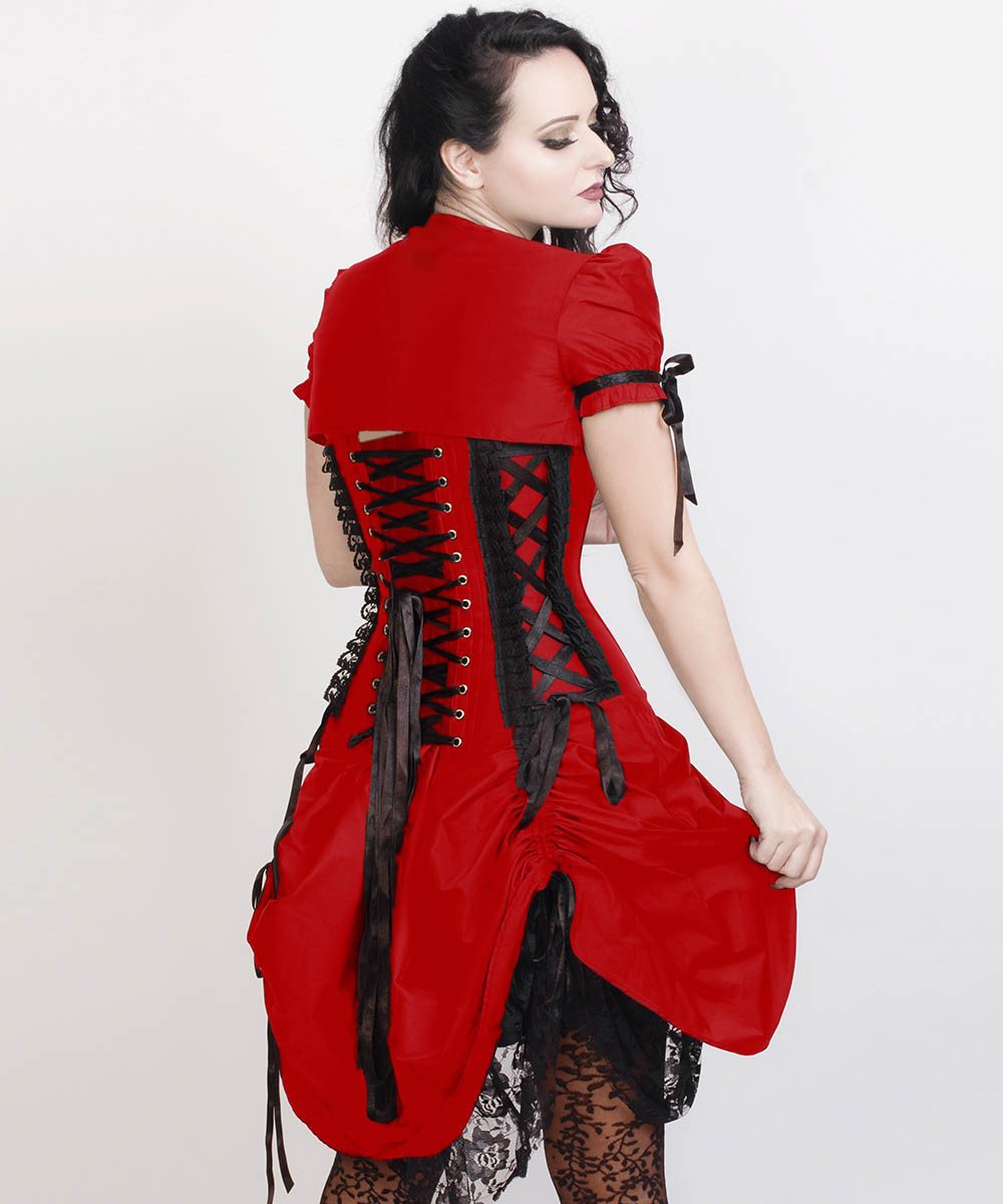 VG-19438: Bolero corset dress in red poly taffeta, drawstring skirt with lace. Laces and modesty panel at rear