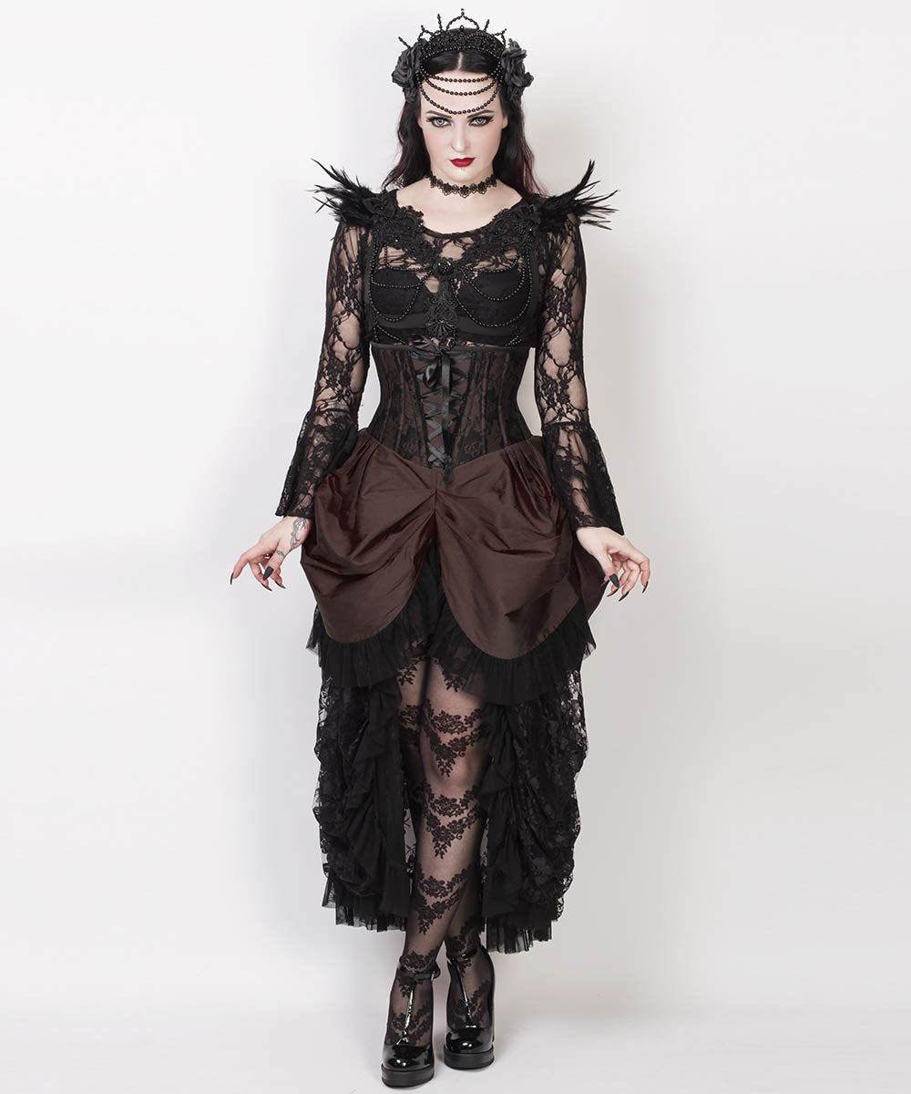 VG-19456: Underbust Corset dress in brown poly taffeta, with laced satin ribbon and floral lace skirt. Laces and modesty panel at rear.