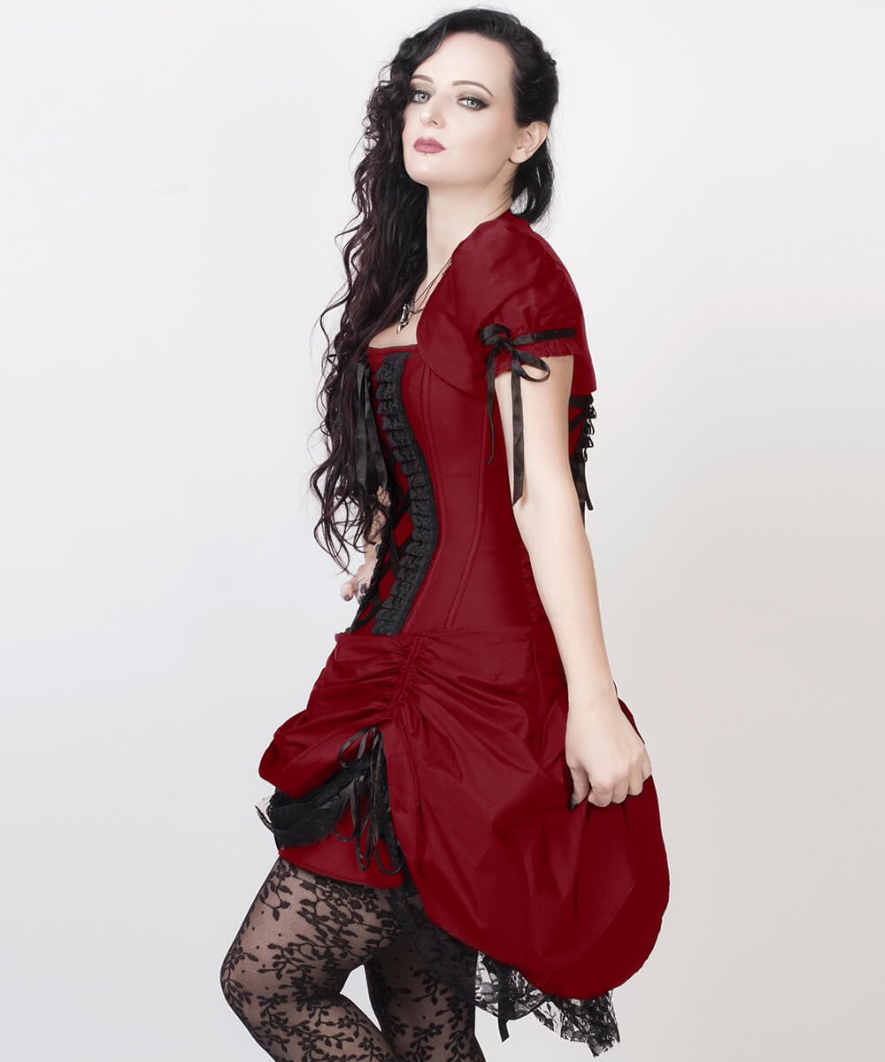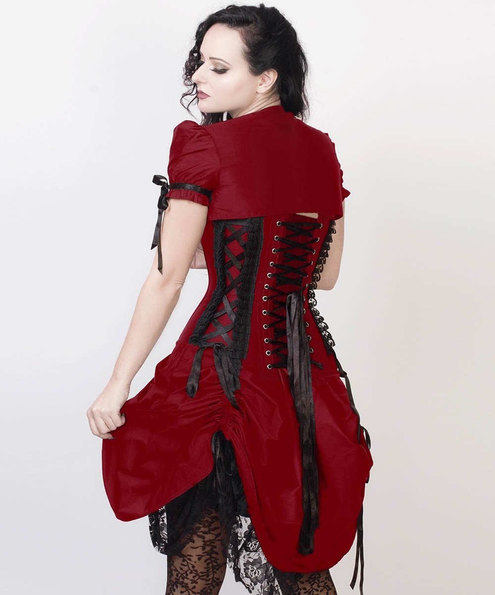 VG-19439: Bolero corset dress in burgundy poly taffeta, drawstring skirt with lace. Laces and modesty panel at rear