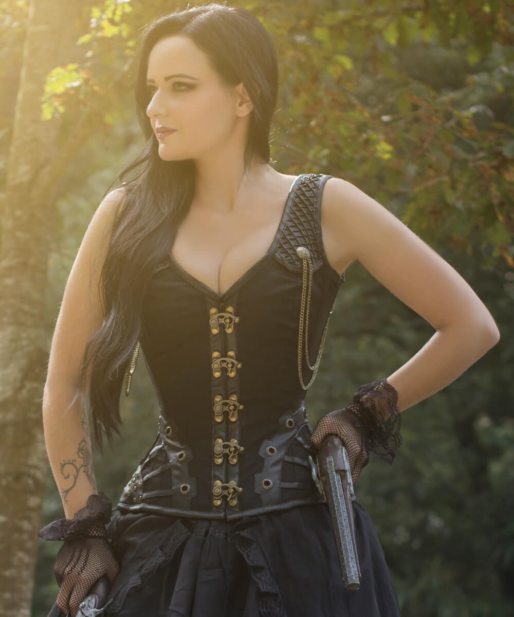 The Engleberta Steampunk Corset is a great component to take advantage of if you’re interested in the steampunk culture along with Victorian and gothic influences. The faux leather and cotton twill fabrics create the perfect illusion of dimension in terms of accentuating your best feminine features. It also helps to make the perfect contrast against the brilliant metal embellishments such as the front opening metal clasps and the chain details. With the lacing on the back of the corset you’ll be able to pull your body into the piece so that it is structured and comfortable for extended wear.