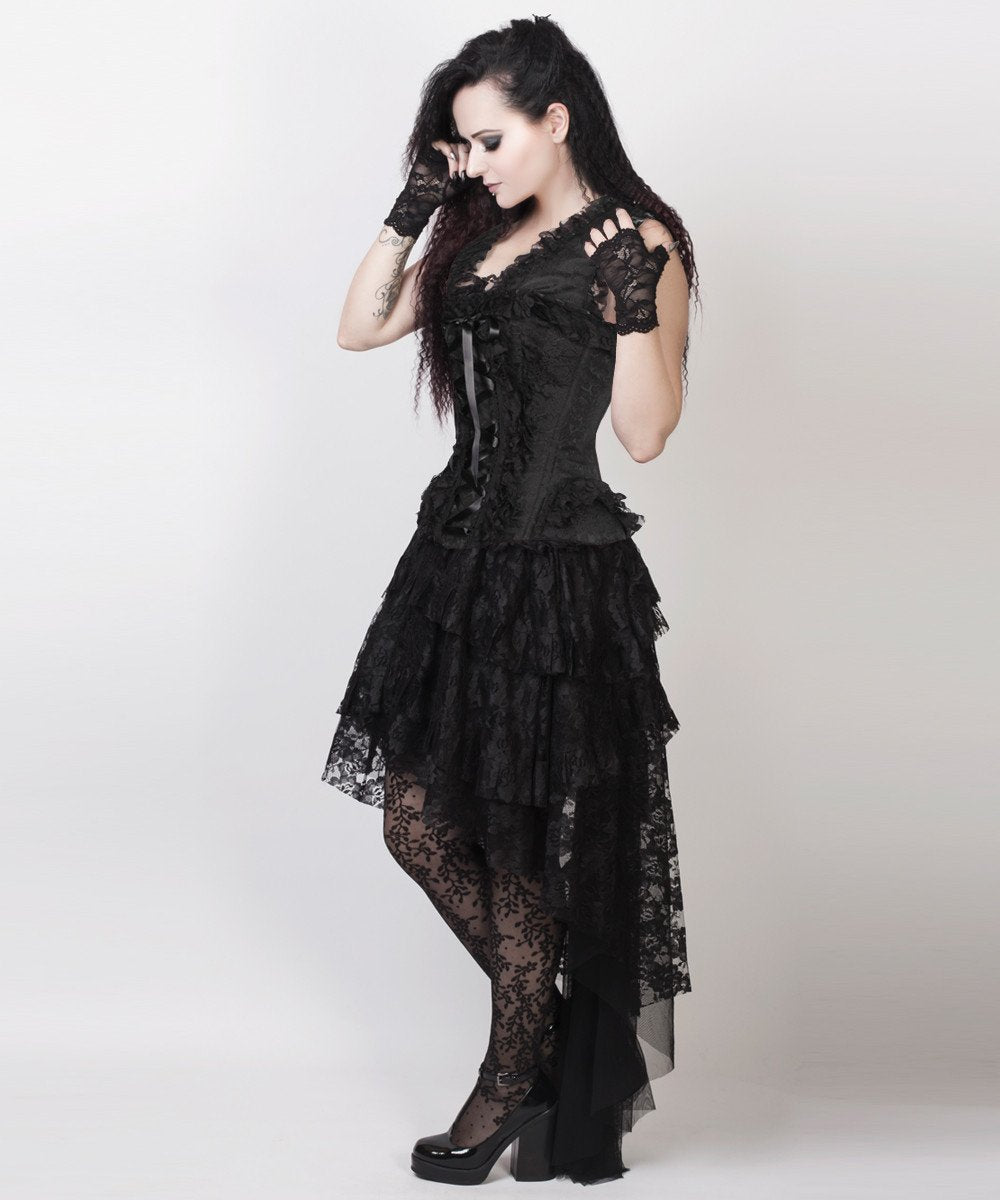 VG-19370: Corset dress in black brocade, with laced satin ribbon and layered floral lace skirt. Laces and modesty panel at rear.