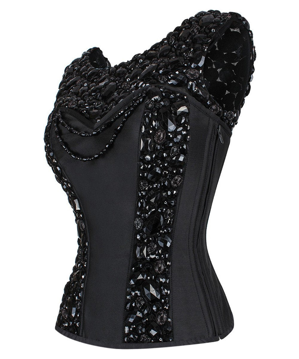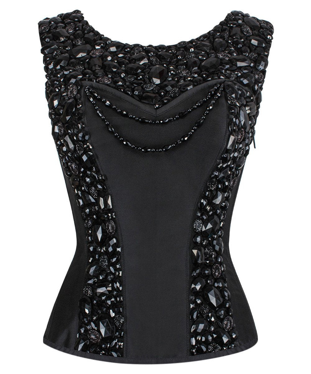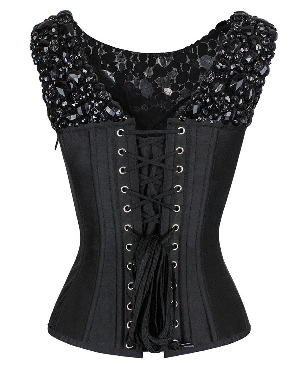 • Spiral Steel Boned Taffeta Black Couture Embroiderd Overbust Corset