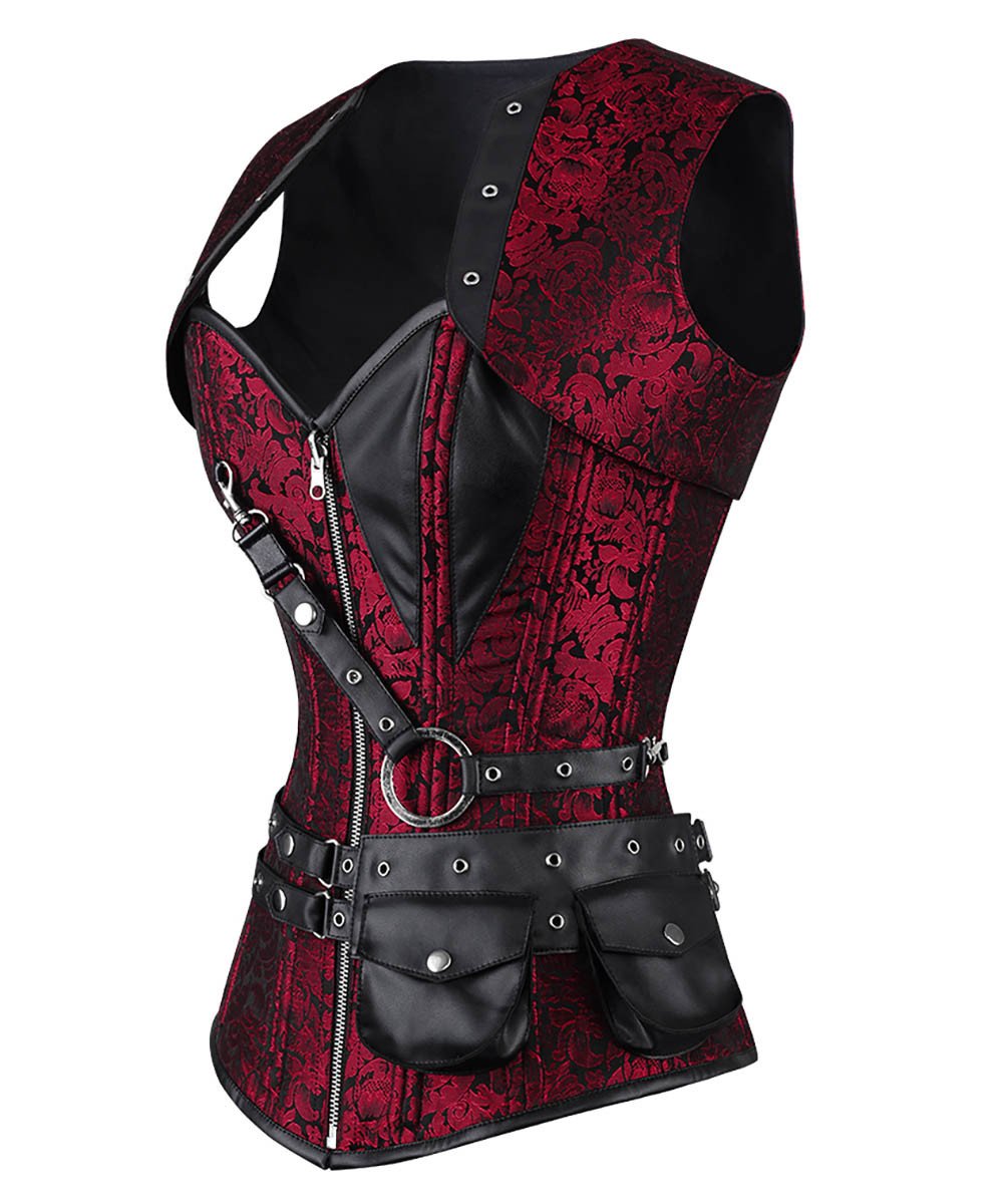 The Winnifred Gothic Reversible Corset is a great piece to take advantage of when you are looking for something that will show off your best features meanwhile give you versatility. You have the option of choose the maroon brocade side of the black faux leather side, both of which accentuate all of the best features of a gothic article of clothing. With the faux leather embellishments and the addition of the side pouch it is just as functional as it is beautiful. The best part is that you are essentially getting 2 corsets for one inclusive price. The back lacing is great for pulling your body into the piece, meanwhile you can use the zipper to get into it.
